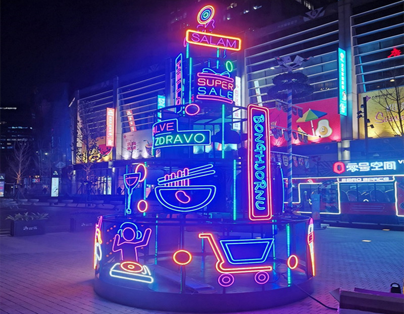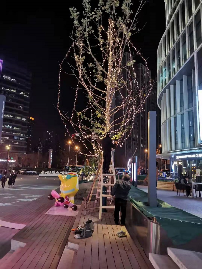 利用灯光技术在望京小街上布局一个铁艺圣诞树,用灯光装扮圣诞树结构,圣诞树上用购物车,餐具,英文字母等灯带进行美陈亮化,体现了望京小街集购物,餐饮,娱乐为一体的特点,具有很强的商业宣传气息,增添了浓浓的节日氛围。