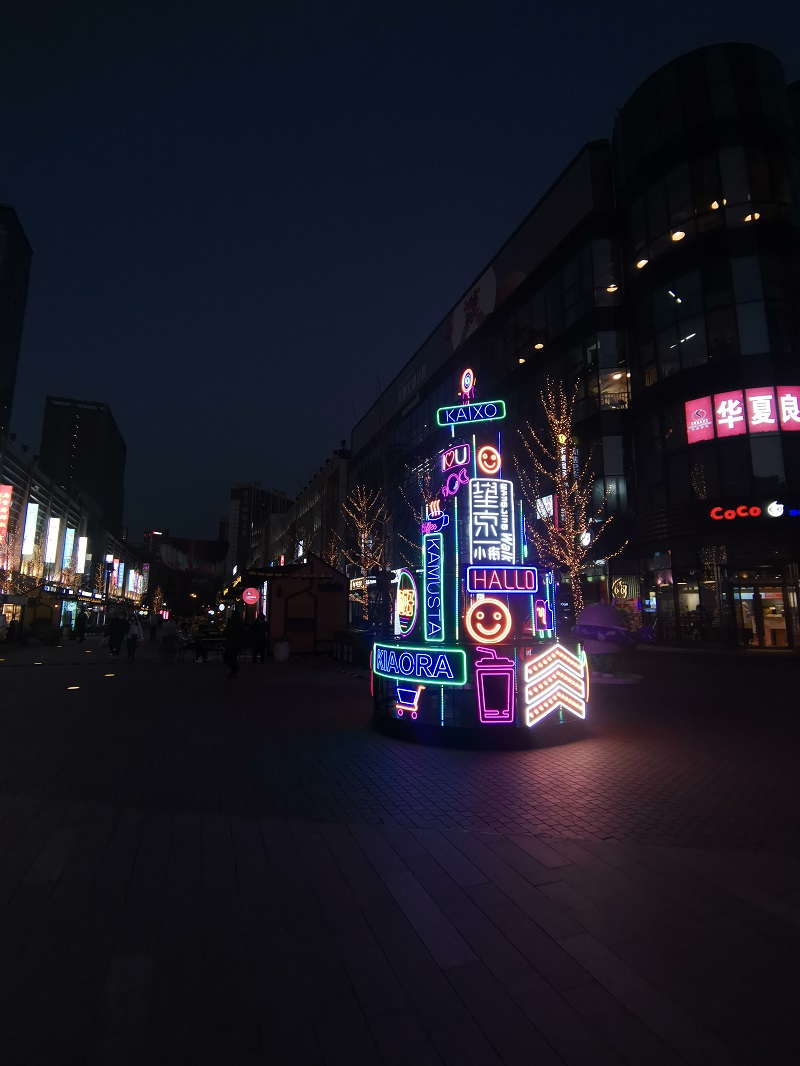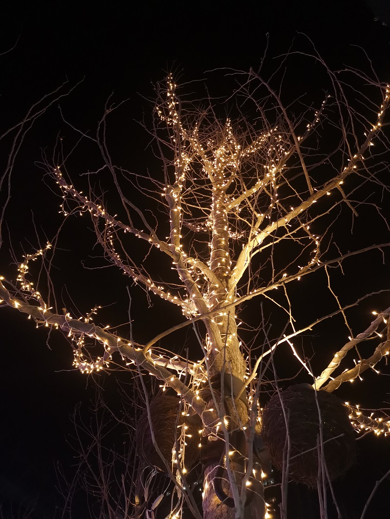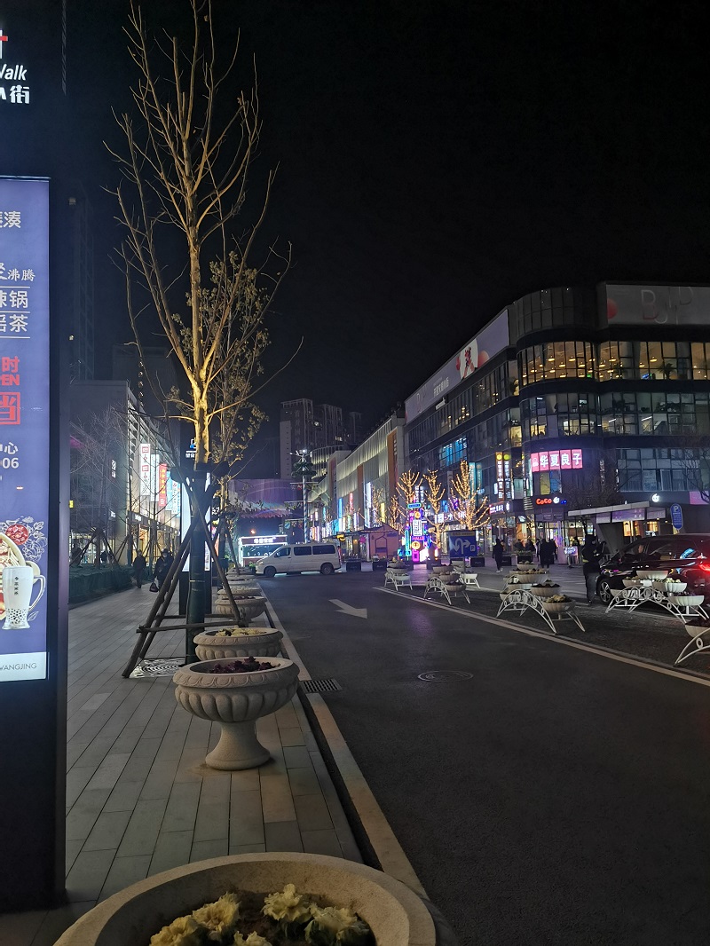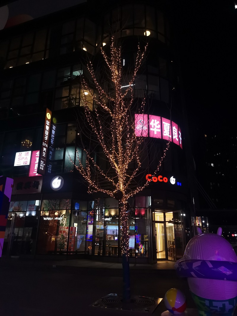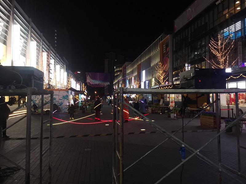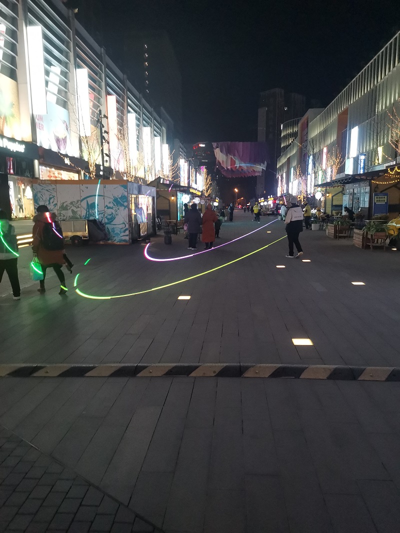 望京小街的两旁的行道树采用串灯进行了装饰亮化,顶部采用造型灯将灯光投影到地面上,体现了极强的商业效果,整个望京小街气氛浓浓,节日感十足。