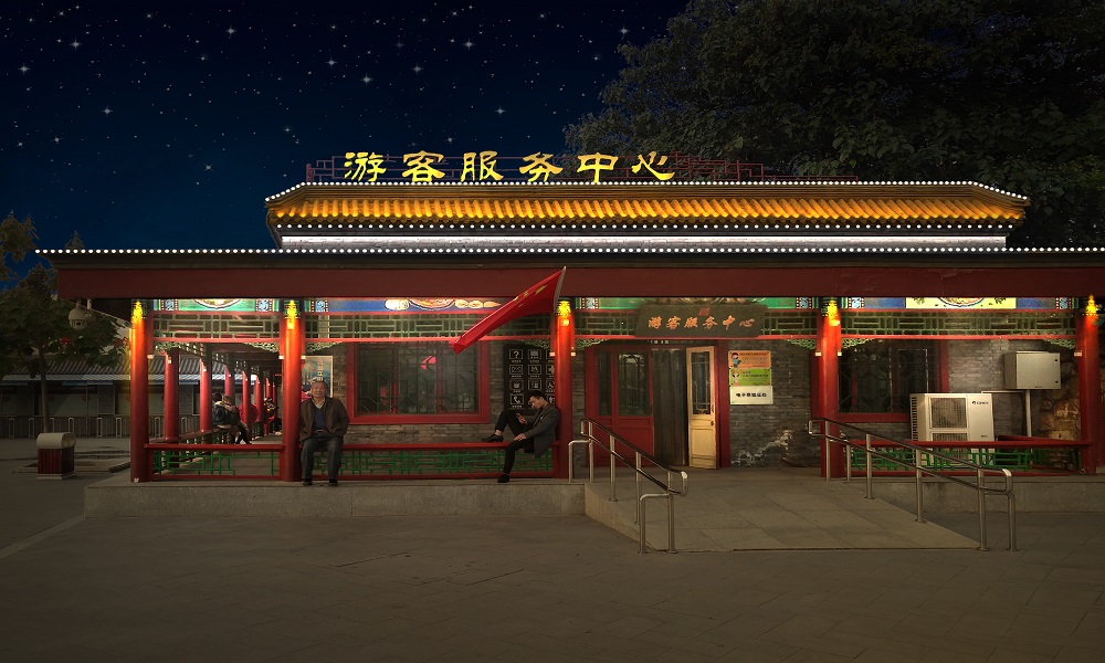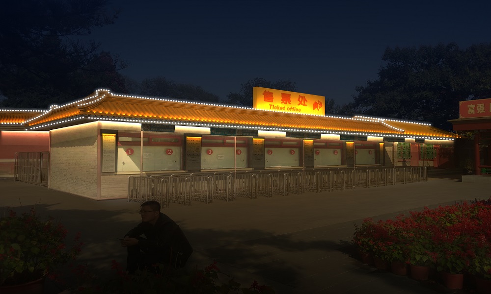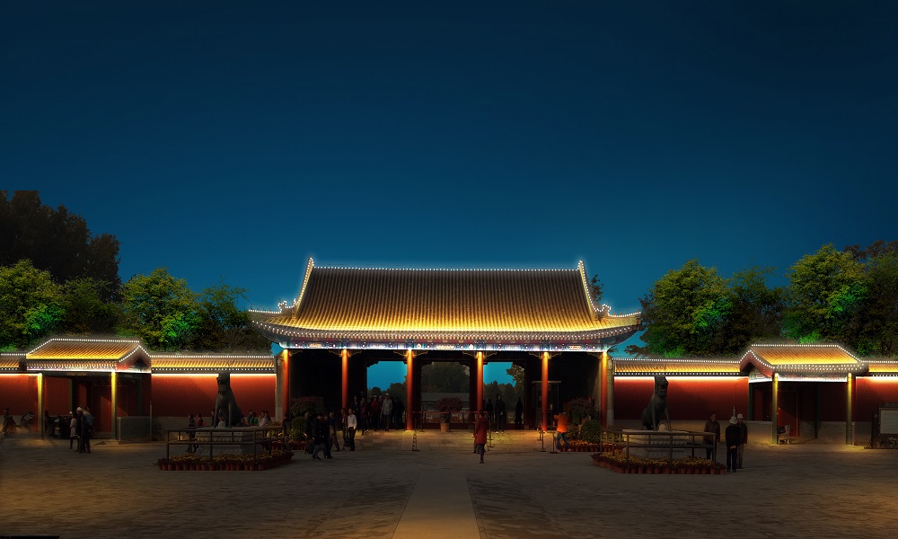 长春圆主要是正门与东西厢房对称组成屋檐结构层次丰富的斗拱,作为古建筑的承重结构,也为照明提供了丰富的展示空间,通过镶嵌其中的小型LED投光灯自下向上投光,将斗拱底部主要受光面用灯光表现出来,加强了建筑的结构美感。城上建筑的照明设计,为体现建筑的历史感沧桑感,在光色选择上选用白和琥珀两种光色。