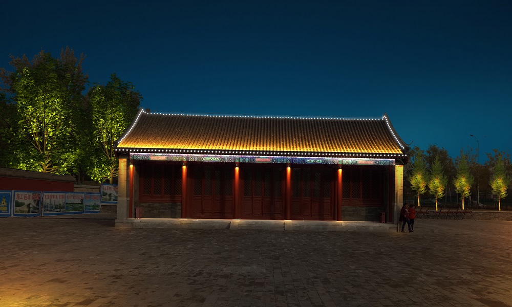 本次设计主要以LED点光源、LED线条灯、LED瓦楞灯组成, LED灯具由于在体积、工作温度上的优势,在层层叠叠的斗拱处能起到安全、见光不见灯的重点照明作用。