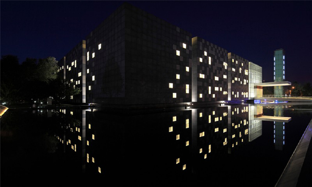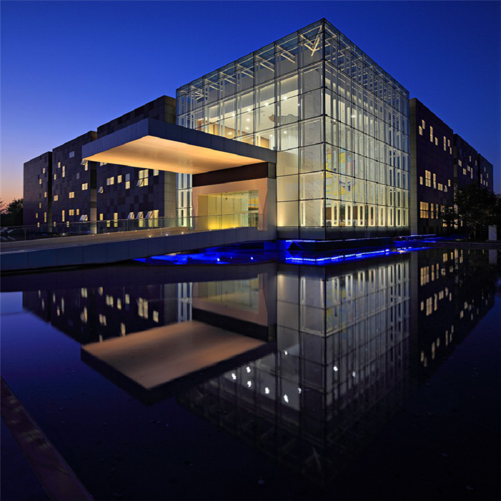 从街边望去,建筑四边清晰可见。入口处的发光的玻璃方块就像个灯笼,从此处开始,向建筑四角方向针对玻璃窗的重点照明逐渐减弱,方块内玻璃窗下方照明灯具的密度减小,照明效果开始递减。行人能够围绕亭子散步,寻找更多有趣的景观。玻璃光盒的照明动静兼具,不仅好似静浮于水池之上,还好像划过星空的拖着星尘之尾的动态流星。置于水池底部的灯具将水纹映到博物馆外墙上,这一景象亦妙趣横生。