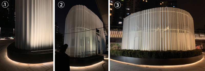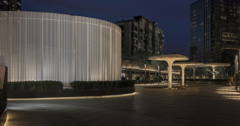 街区内点状分布的白色孔板盒子,被设计成承担不同功能性空间角色的岛屿:艺术空间、商街入口、地铁站入口。经过现场反复试验,最终将光线设置在白色孔板盒子内部,降低其表面亮度使之完美融于环境的同时,还意外带来岛屿漂浮的朦胧美感。在厚钢板围合而成的种植池底部设置暗藏光线,让光如同流水一般充分自然地溢散出来。商户沿街立面采用了横向百叶的建筑设计语言,呈现出起伏流畅的山水造型。照明设计增加连续的上照光线,凸显百叶的细微变化,产生的阴影强化了连续、有节奏的光线排布,带来山峦起伏之感。当人们站在商业街内看向两侧,在绿树掩映下,顿然生出置身山水之间的光照体验。