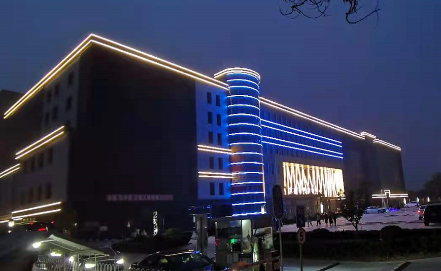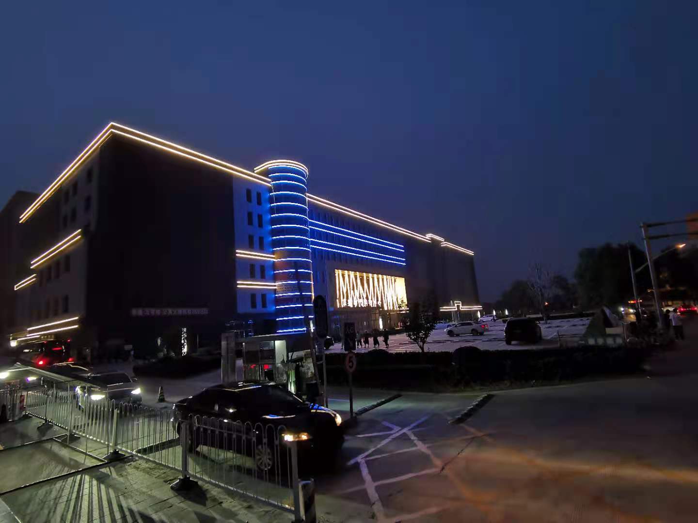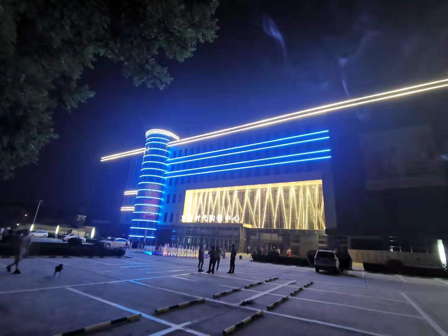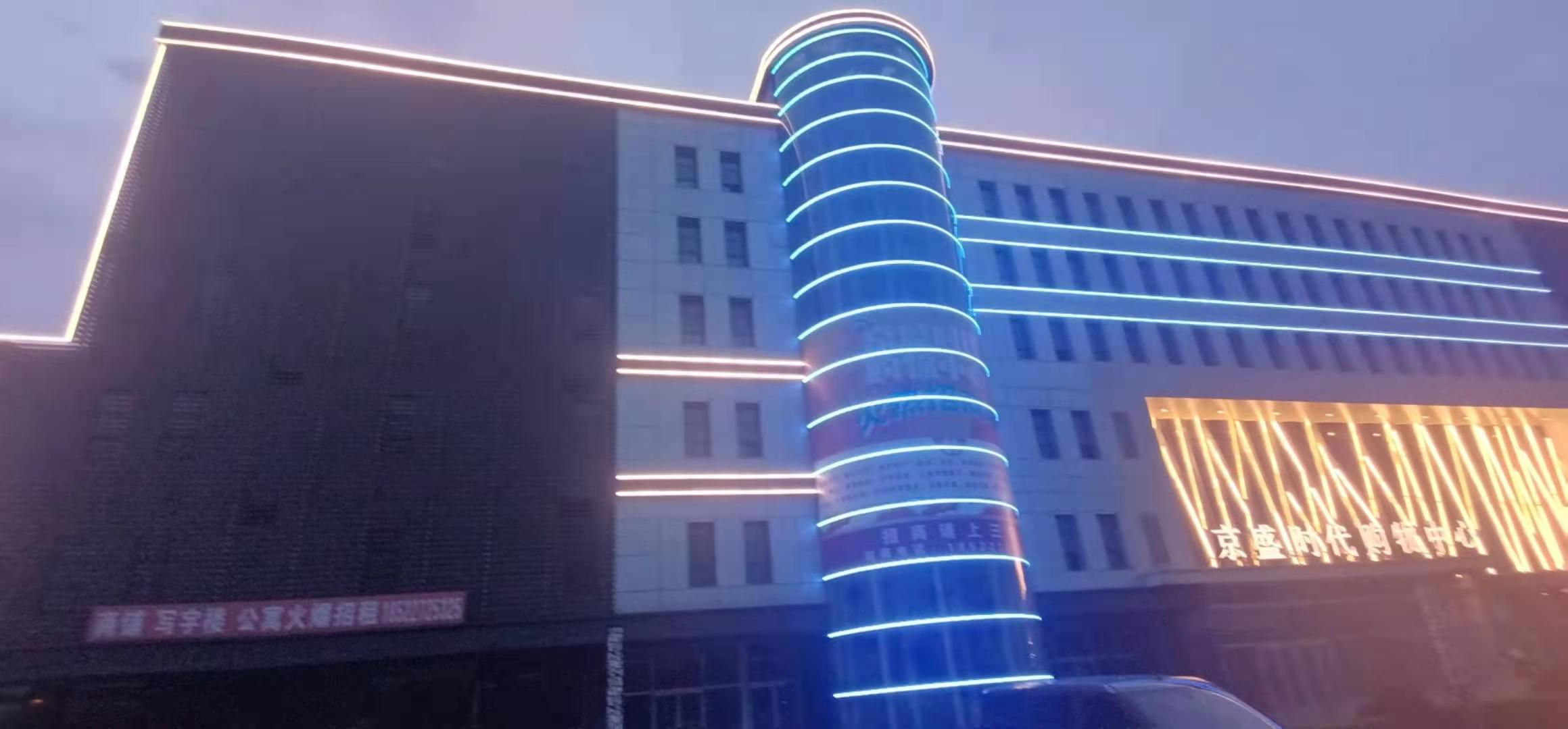 京盛广场购物中心亮化主要采用线条灯照明,商场中部外立面主要采用蓝色线条灯进行打亮,商场的观光电梯也采用线条灯,围绕电梯呈旋转式布置,商场顶部采用暖光线条灯照明,整体亮化设计独特,显眼,起到了很好的商业效果。